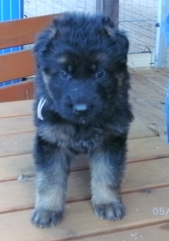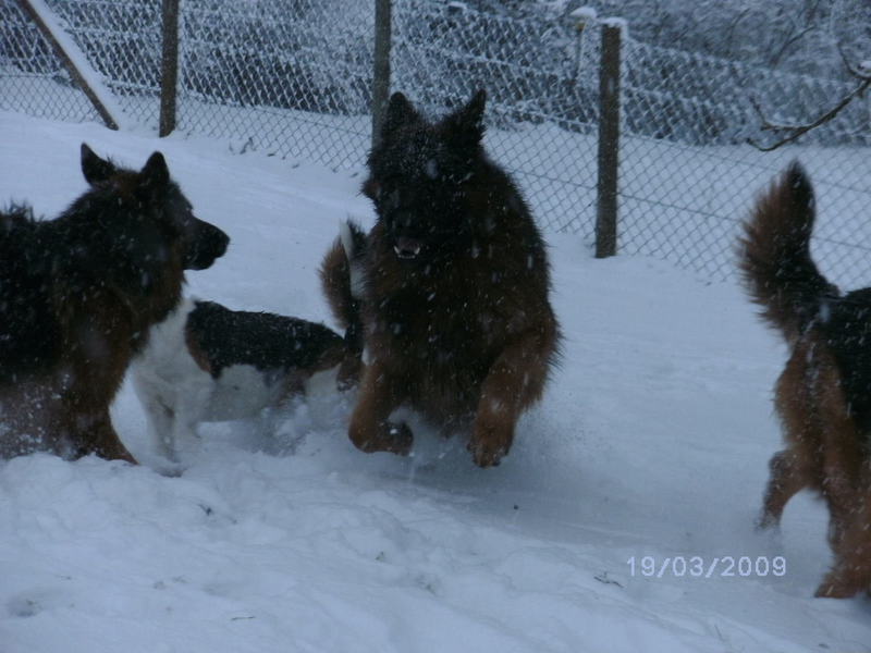 Dieses Foto zeigt Froni hinten links und Andrah vorne rechts und 3 von Froni´s Welpen aus dem A-Wurf: Ajax, Arco und Alma.